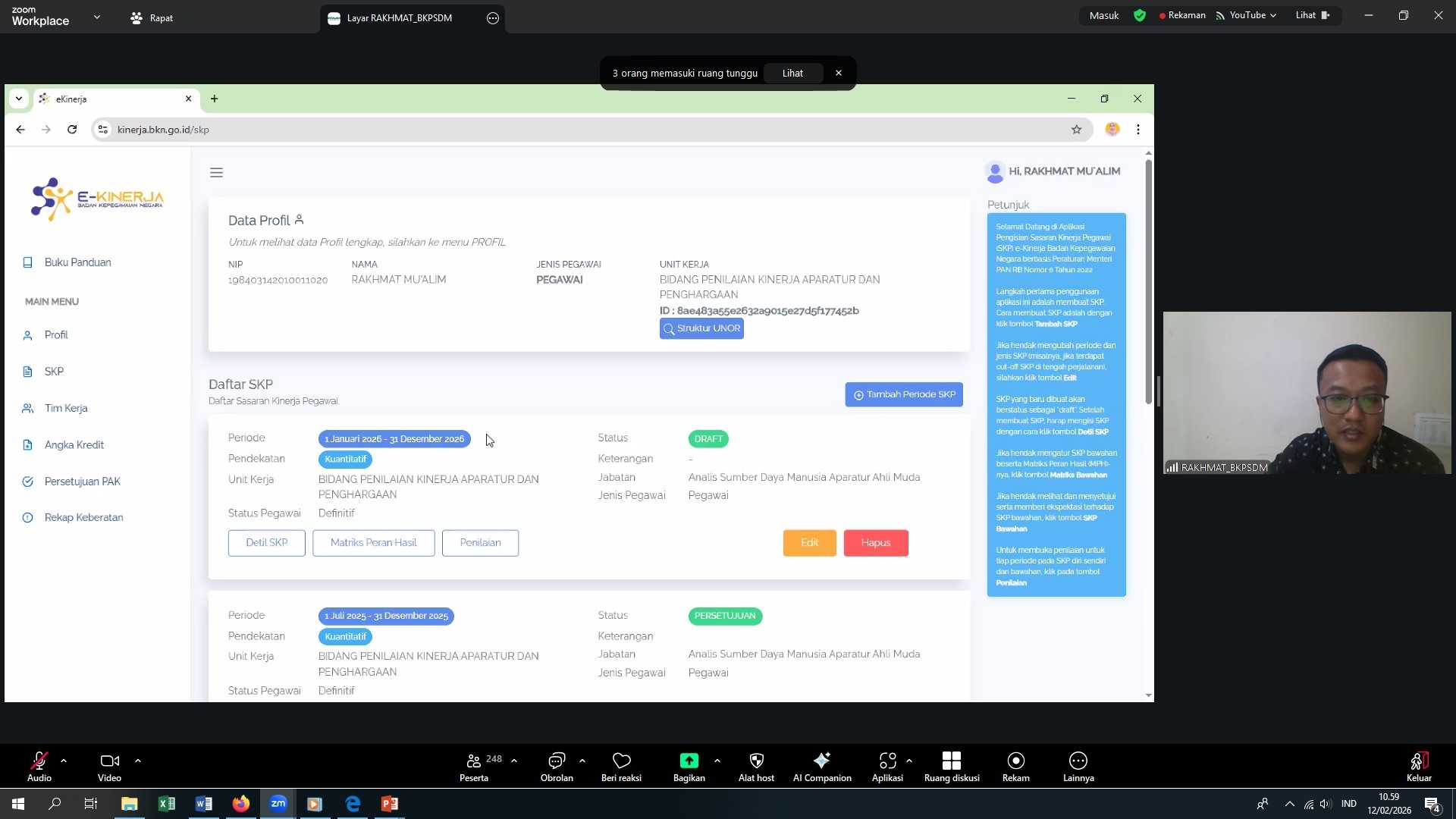 Bimbingan teknis penyusunan SKP tahun 2026 disampaikan oleh dua narasumber yaitu Kepala Bidang Penilaian Kinerja Aparatur dan Penghargaan Bapak Anggra Firmansyah, S.Psi dan Pejabat Fungsional Analis Sumber Daya Manusia Aparatur Ahli Muda Bapak Rakhmat Mualim, S.Pd,MM. Para peserta zoom meeting sangat antusius dengan materi ini dengan menyampaikan pertanyaan melalui kolom chat dan juga raise hand untuk ditanyakan kepada para narasumber tentang penyusunan SKP tahun 2026. Peserta Bimtek juga akan mendapatkan sertifikat 3 JP jika sudah scan barcode atau memasukkan kode pada Siperlu masing-masing saat acara berlangsung.