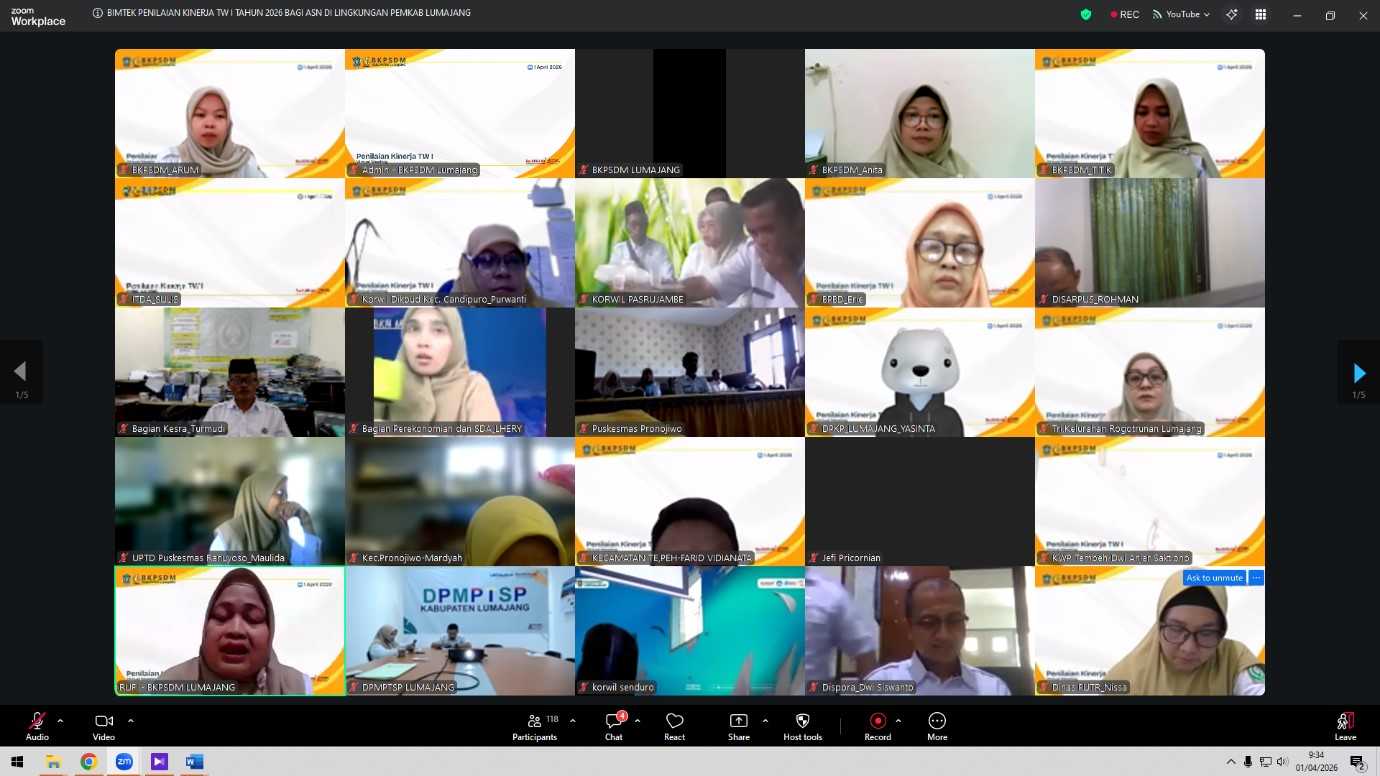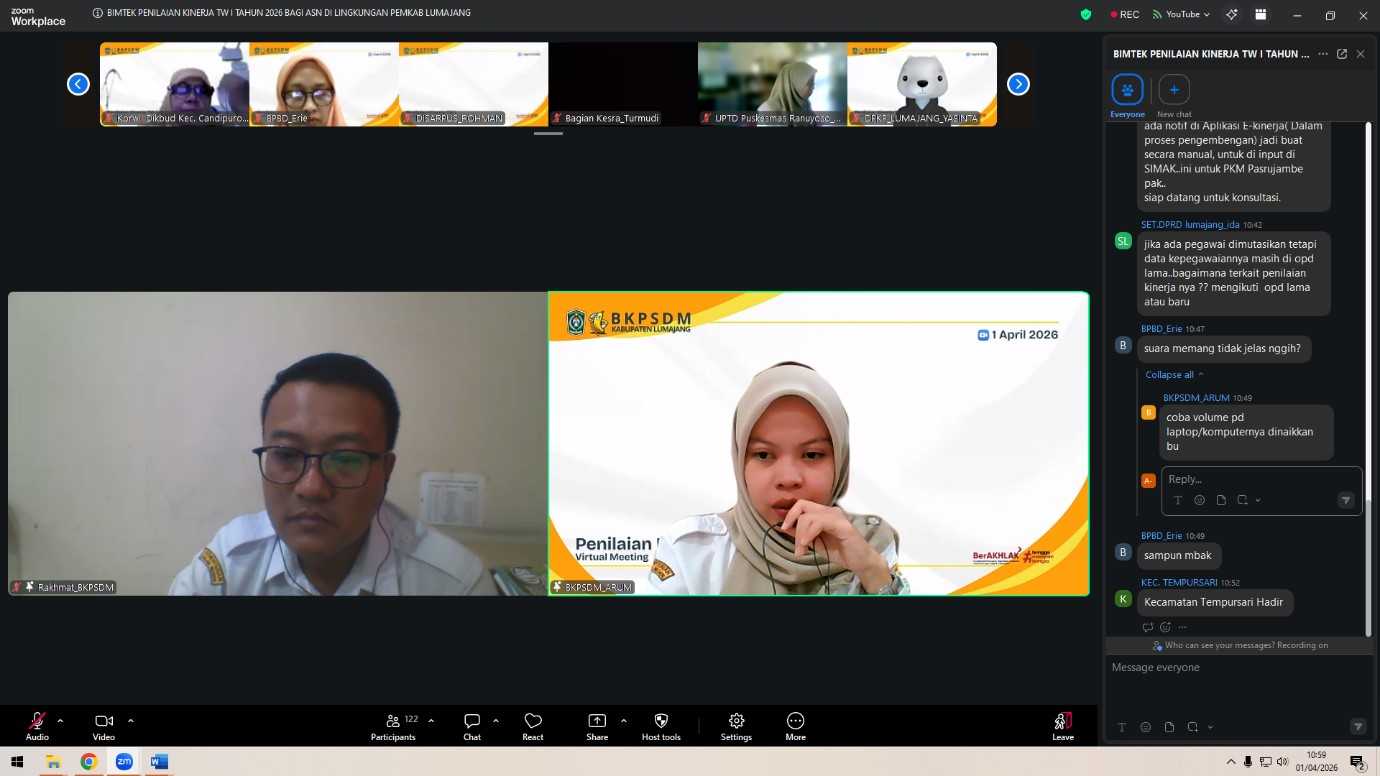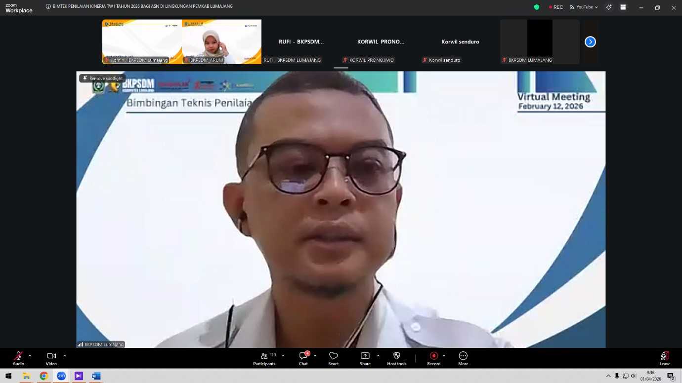 Lumajang - Pada hari Rabu, 1 April 2026, dimulai pukul 09.00 WIB sampai dengan pukul 12.00 WIB melalui Zoom Meeting serta live streaming youtube Badan Kepegawaian dan Pengembangan Sumber Daya Manusia (BKPSDM) Kabupaten Lumajang Bidang Penilaian Kinerja Aparatur dan Penghargaan mengadakan Kegiatan Bimbingan Teknis (Bimtek) Penilaian Kinerja Triwulan I Tahun 2026 Bagi ASN di Lingkungan Pemerintah Kabupaten Lumajang, peserta bimbingan teknis pada hari ini adalah 172 orang, terdiri dari Kasubbag Umum dan Kepegawaian dan pengelola kepegawaian OPD, admin kepegawaian Puskesmas, serta admin Korwil Dikbud di Lingkungan Pemerintah Kabupaten Lumajang.
